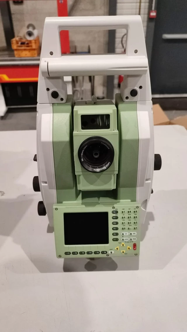 The Leica Geosystems TS30 0.5" Total Station is a sophisticated surveying instrument renowned for its 0.5" angular accuracy and robust reflectorless range capability. This particular model, item number 757130, was manufactured in 2010 and has been previously used. It is designed to perform precise distance measurements and can endure a variety of environmental conditions.